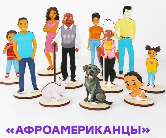 Используется для моделирования семейных отношений с учётом особенностей афроамериканской культуры и социального контекста. Фигурки представляют семью: родители, дети, пожилые родственники. Образы передают характерные черты и символику афроамериканского сообщества.