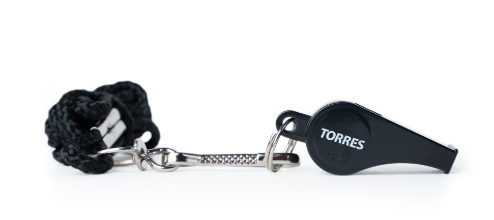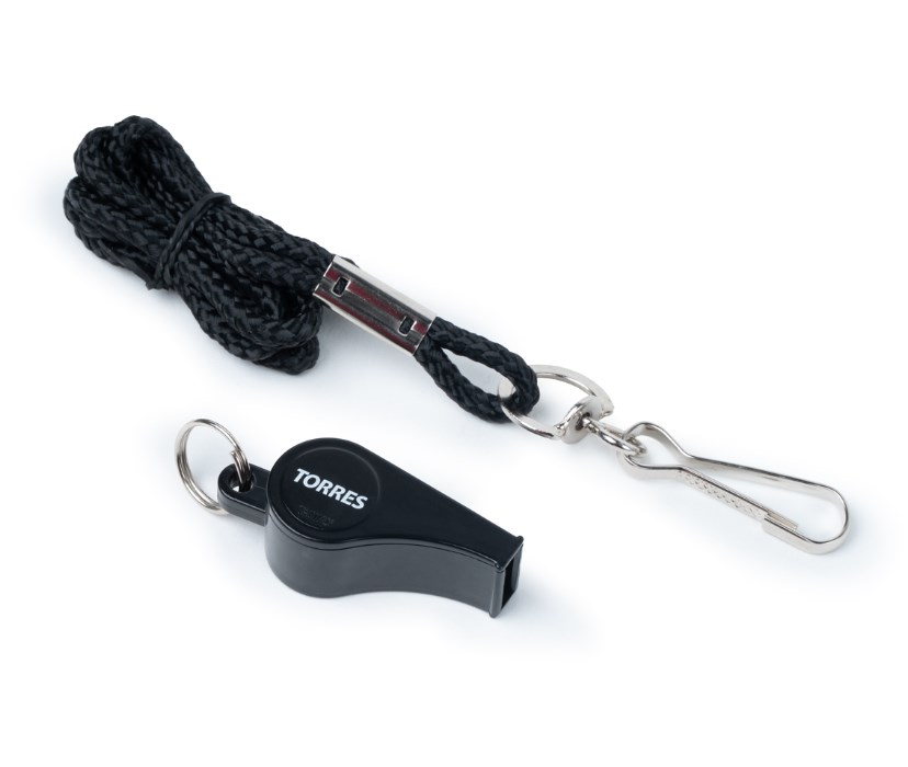 Свисток пластиковый с пробковым шариком TORRES. Шнурок с карабином входит в комплект.